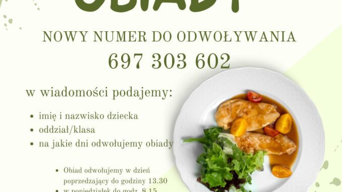 NOWY NUMER TELEFONU DO ODWOŁYWANIA OBIADÓW 19 maja 2025 lborkowski Aktualności, Ogłoszenia 0 Uprzejmie informujemy, iż od czerwca obowiązuje nowy numer do odwoływania obiadów: 697 303 602