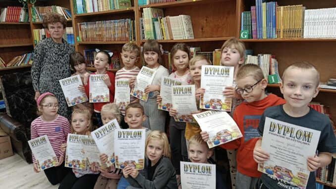 Wcześniej w bibliotece szkolnej miało miejsce uroczyste pasowanie uczniów klasy I na czytelnika. Pasowanie uświadamia uczniom, jak wielką moc ma czytanie, dlaczego warto być czytelnikiem,ale także jak ważne jest rozwijanie miłości do książek już od najmłodszych lat. Dzieci aktywnie uczestniczyły w spotkaniu, chętnie odpowiadały na pytania bibliotekarza i same zadawały pytania dotyczące biblioteki. Pierwszoklasiści wykazali się bardzo dobrą znajomością bajek i baśni. Bez trudu odgadywali tytuły książek i wskazywali głównych bohaterów. Finalnym momentem spotkania było ślubowanie oraz pasowanie na czytelnika, a także wręczenie pamiątkowych dyplomów i wypożyczenie wszystkich dzieciom lektury „Cukierku, ty łobuzie!” autorstwa Waldemara Cichonia.
