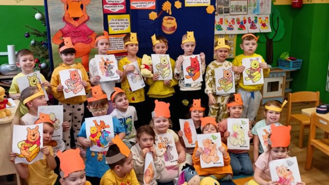 Dnia 14 stycznia w oddziałach przedszkolnych obchodzony był Dzień Kubusia Puchatka🧸🍯. Z tej okazji dzieci wzięły udział w wesołych zabawach ruchowych🤸🏃⛹️, zabawach przy muzyce oraz z uwagą wysłuchały opowiadania o Kubusiu i jego przyjaciołach📖. Przedszkolaki uczestniczyły także w rozwiazywaniu zagadek nawiązujących do postaci bajkowych. Następnie dzieci kolorowały🖍️ rysunek Kubusia. Nie zabrakło również dla chętnych degustacji słodkiego przysmaku Kubusia – miodu🍯🍯🍯. Wszystkie dzieci bardzo chętnie i z dużym zaangażowaniem uczestniczyły we wszystkich zabawach❤️🙂